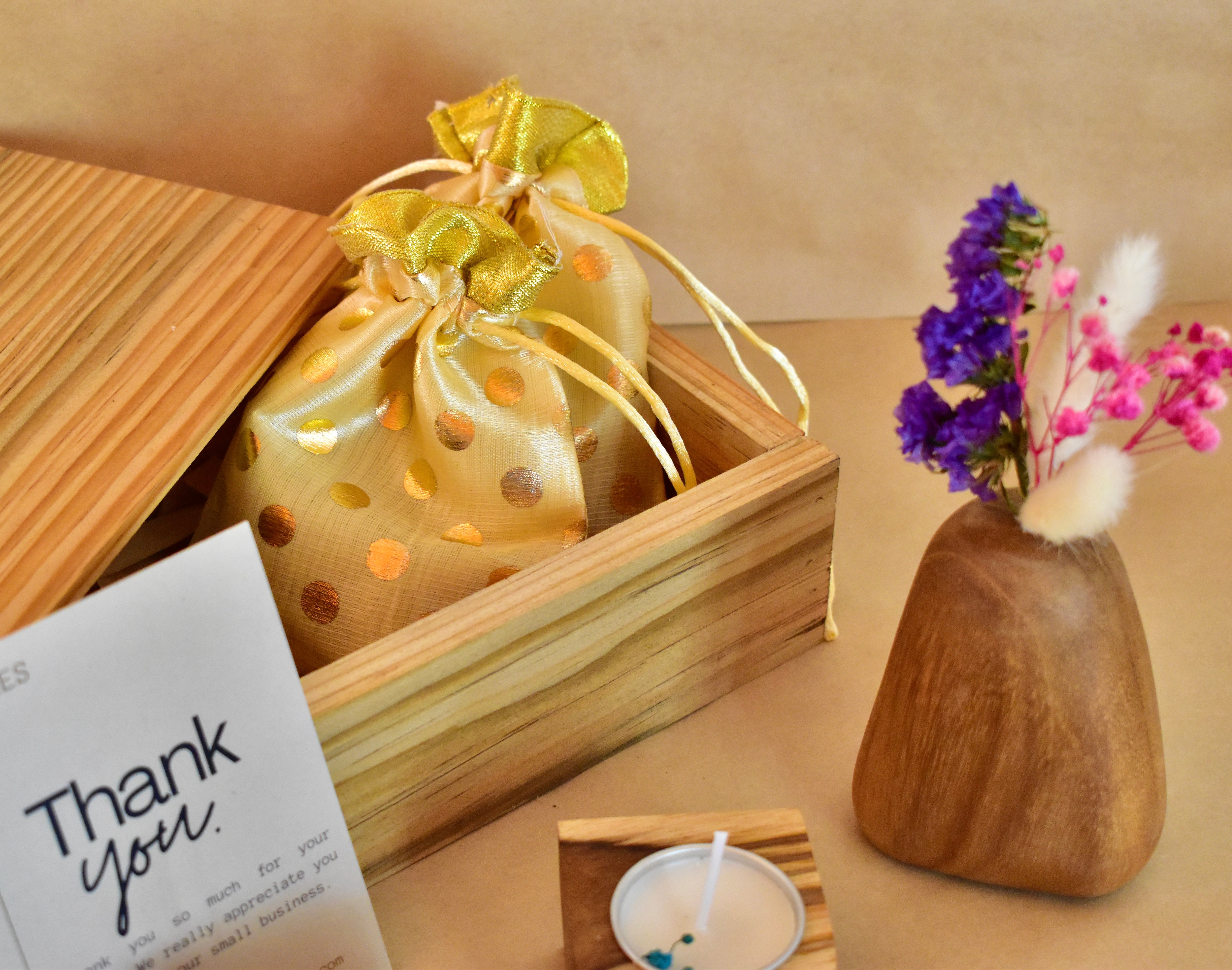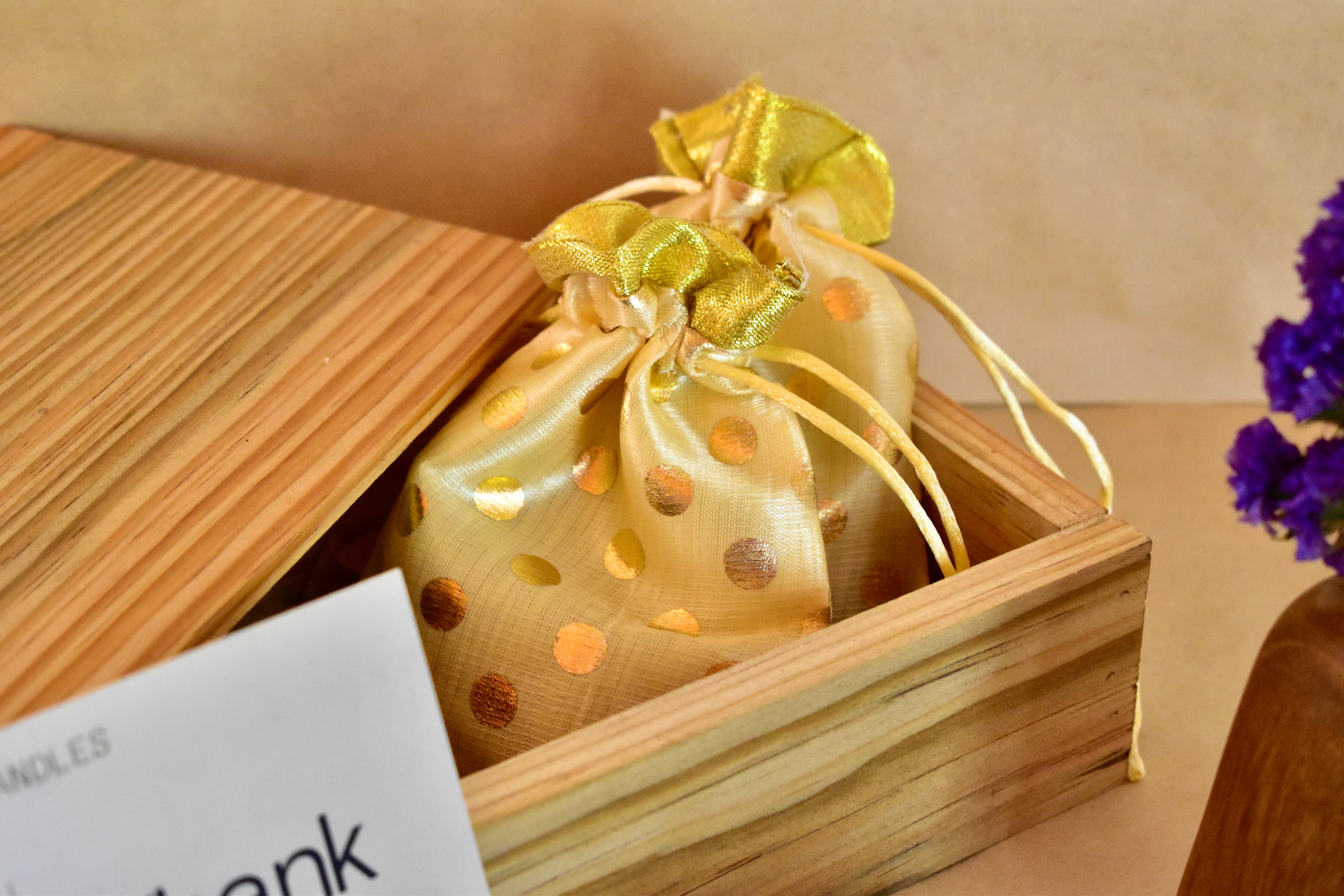 🎁 A golden potli bag filled with surprises, wrapped in shimmer fabric for a festive touch.