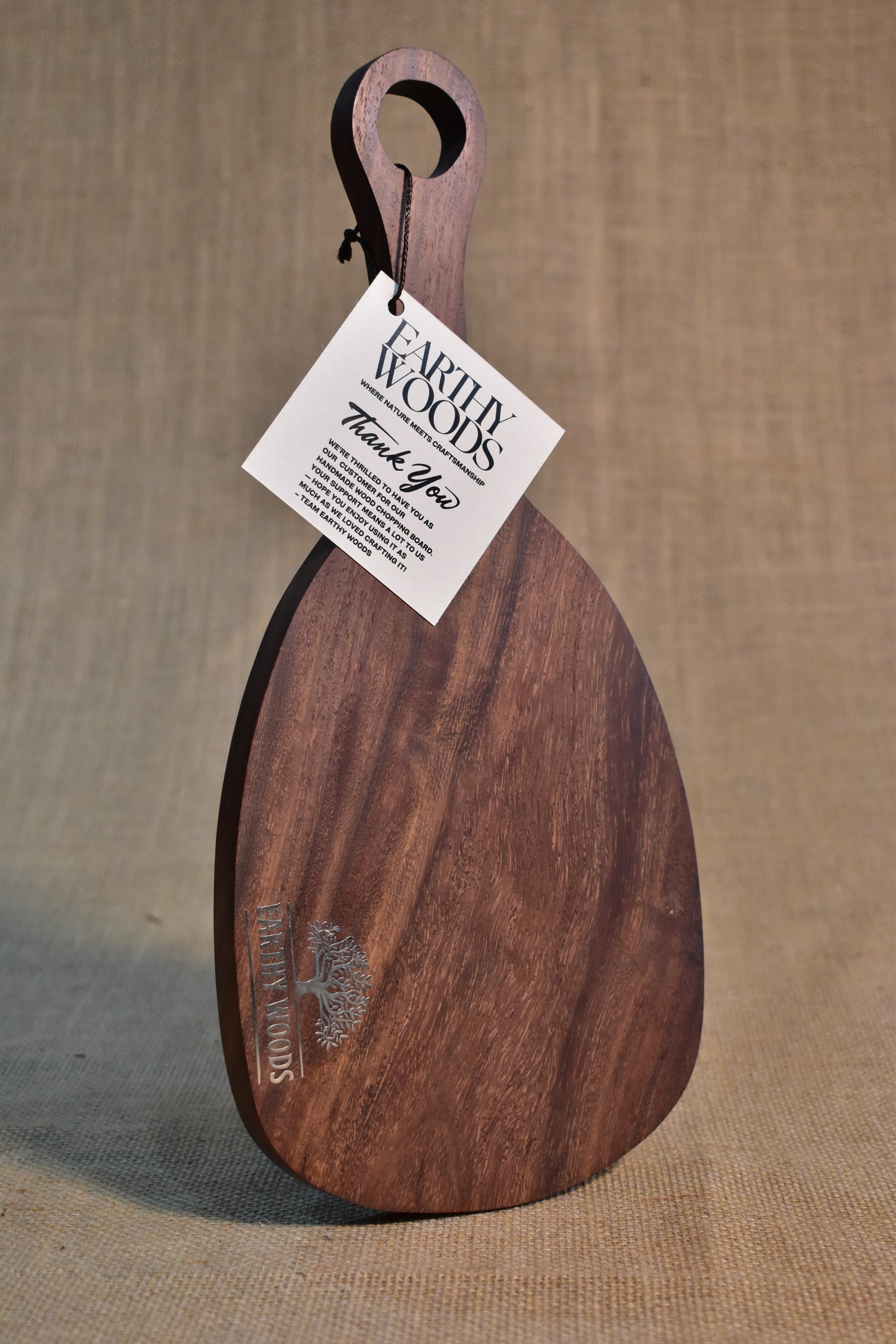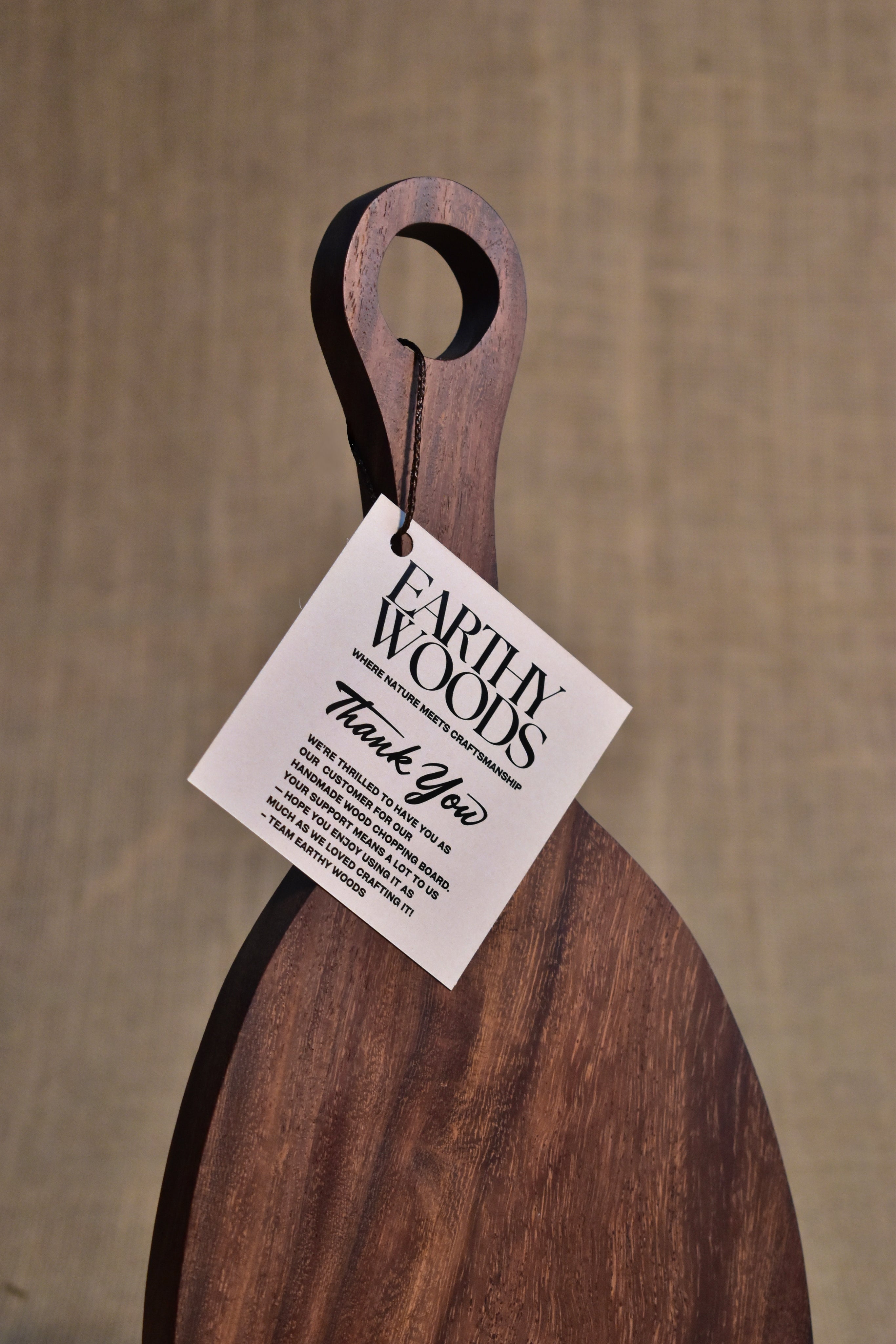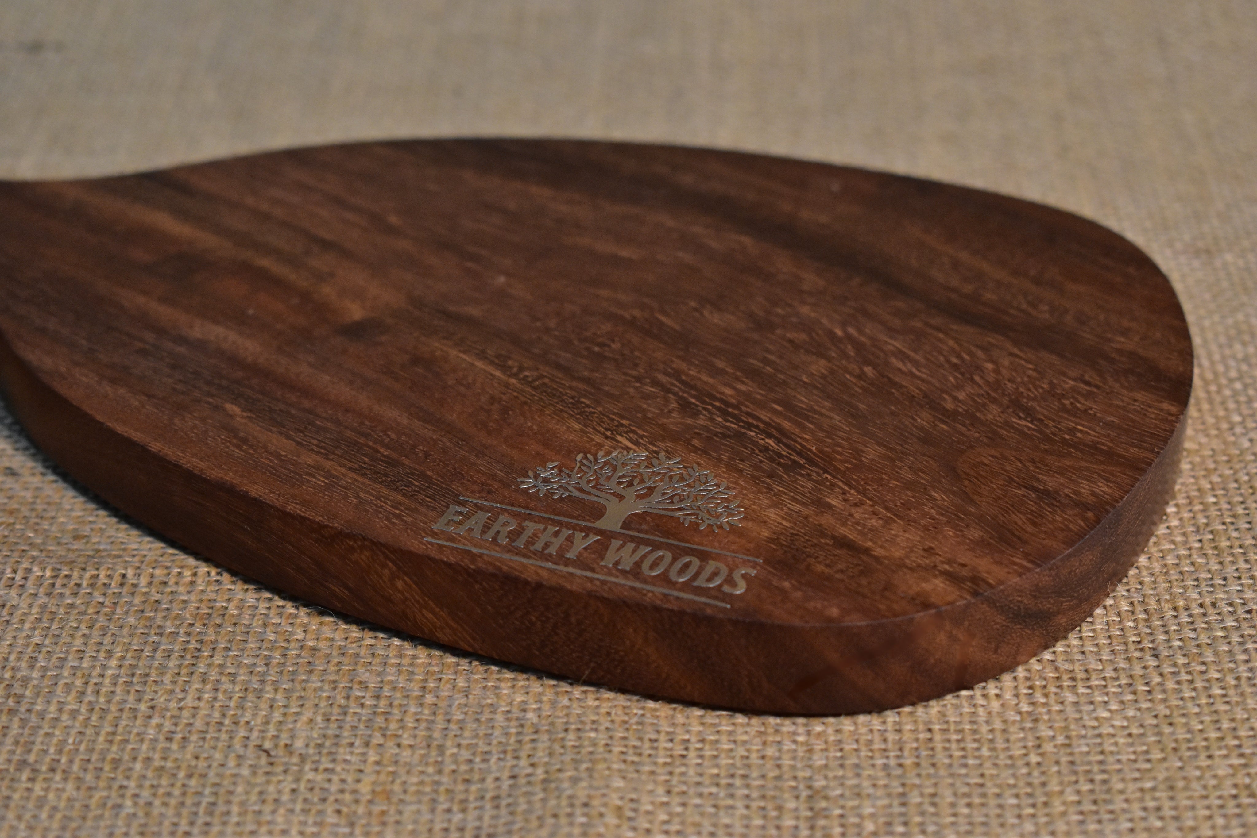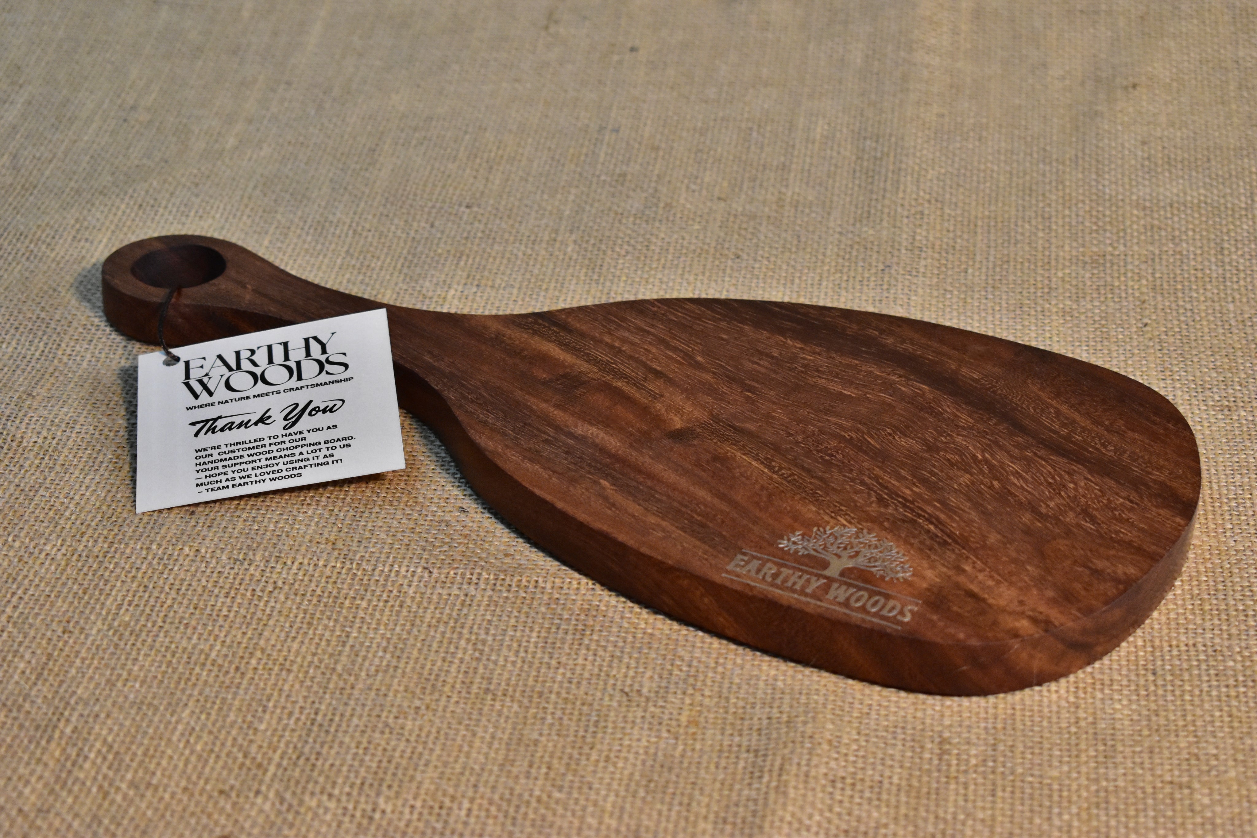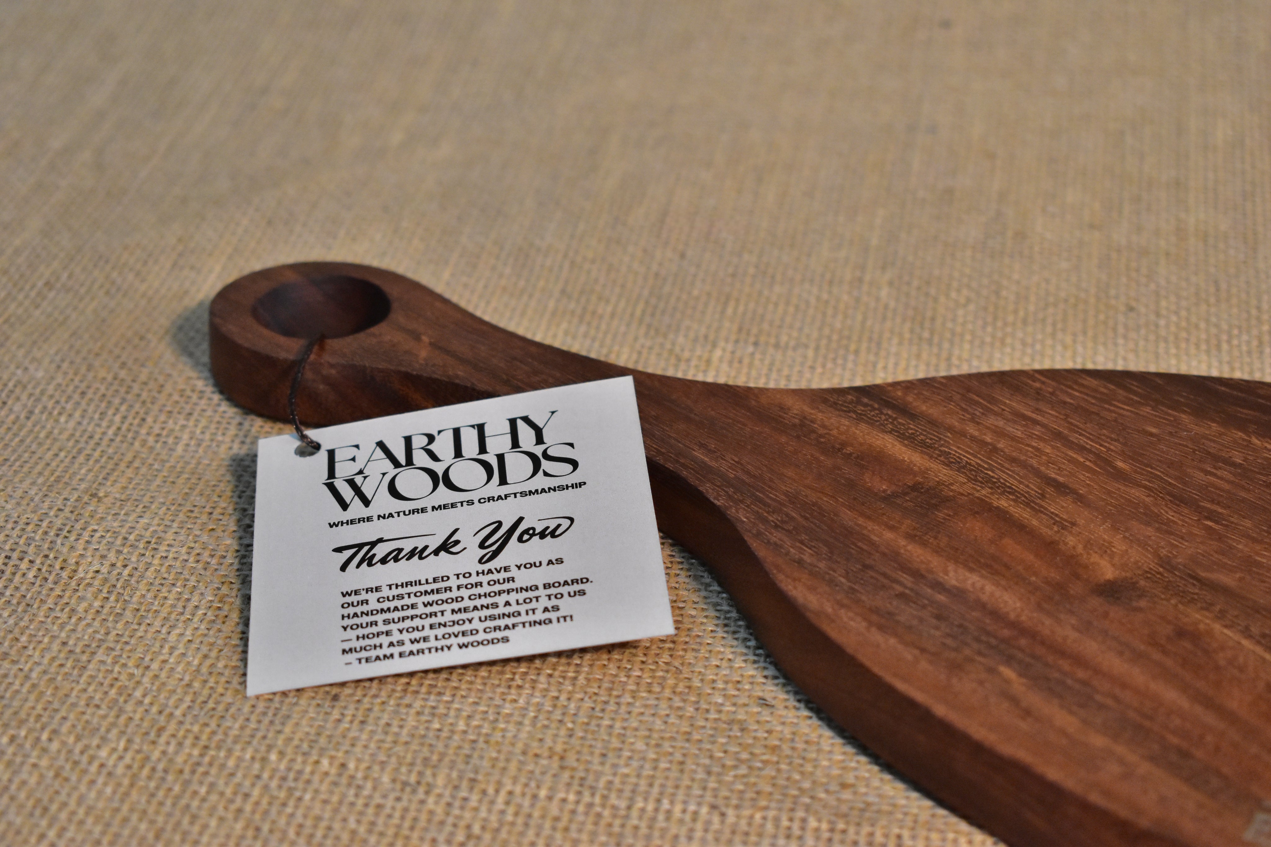Elevate your kitchen with this beautifully handcrafted Indian Rosewood Chopping Board from Earthy Woods. Designed with a smooth, rounded silhouette and an elegant handle, this board showcases the rich grains and warm natural tones of premium Sheesham wood.